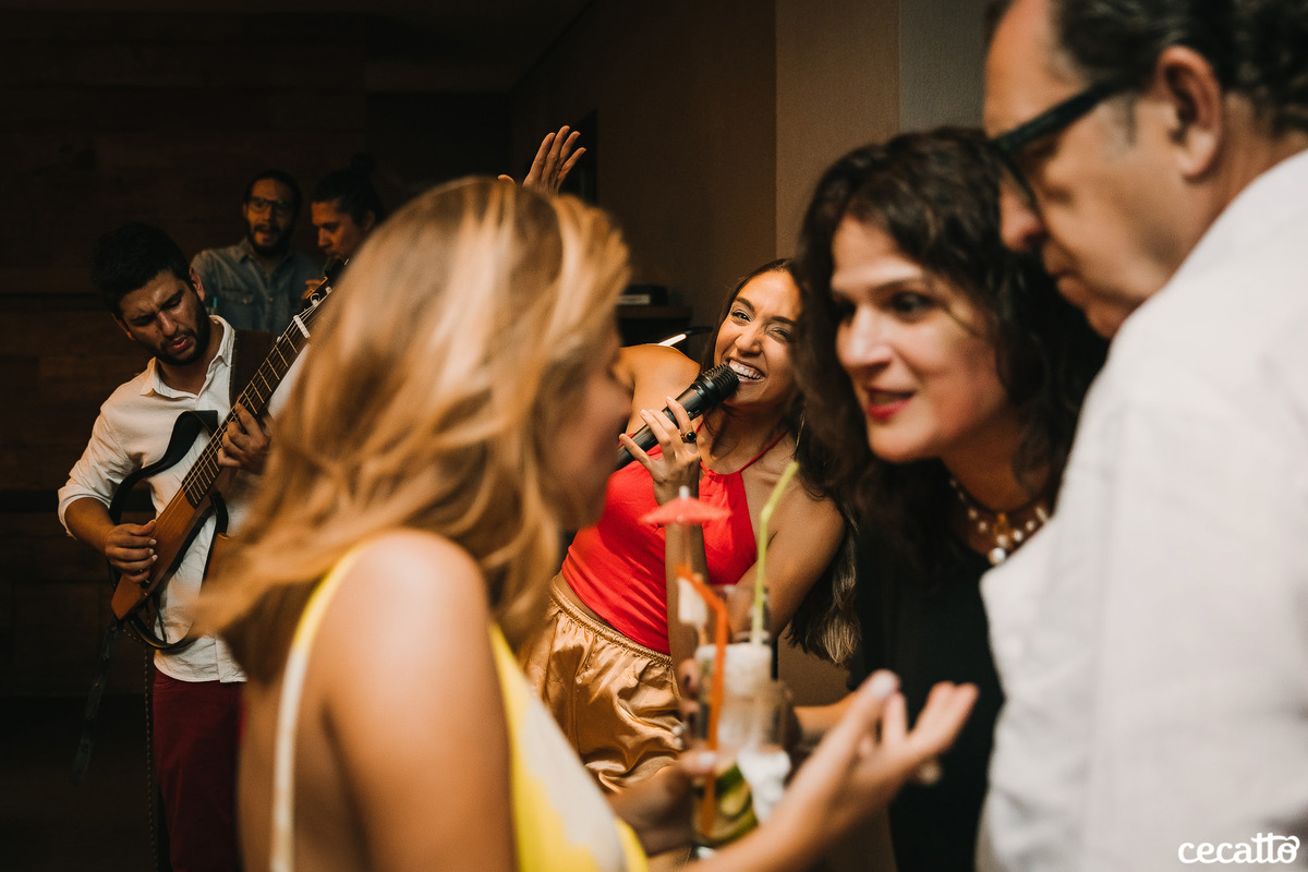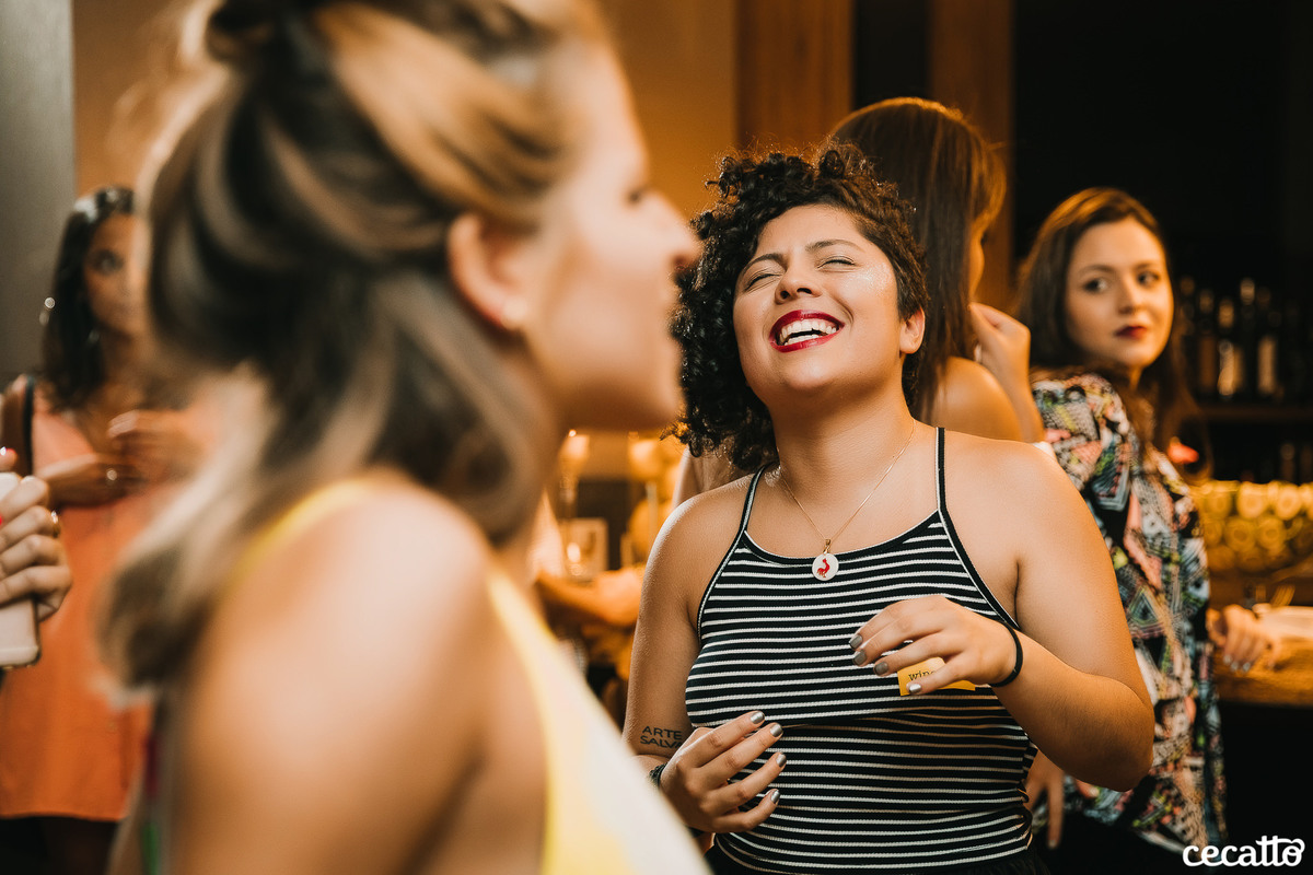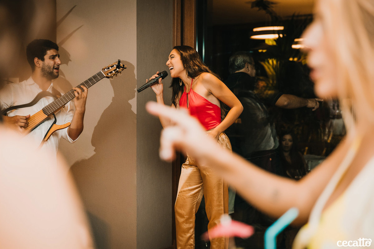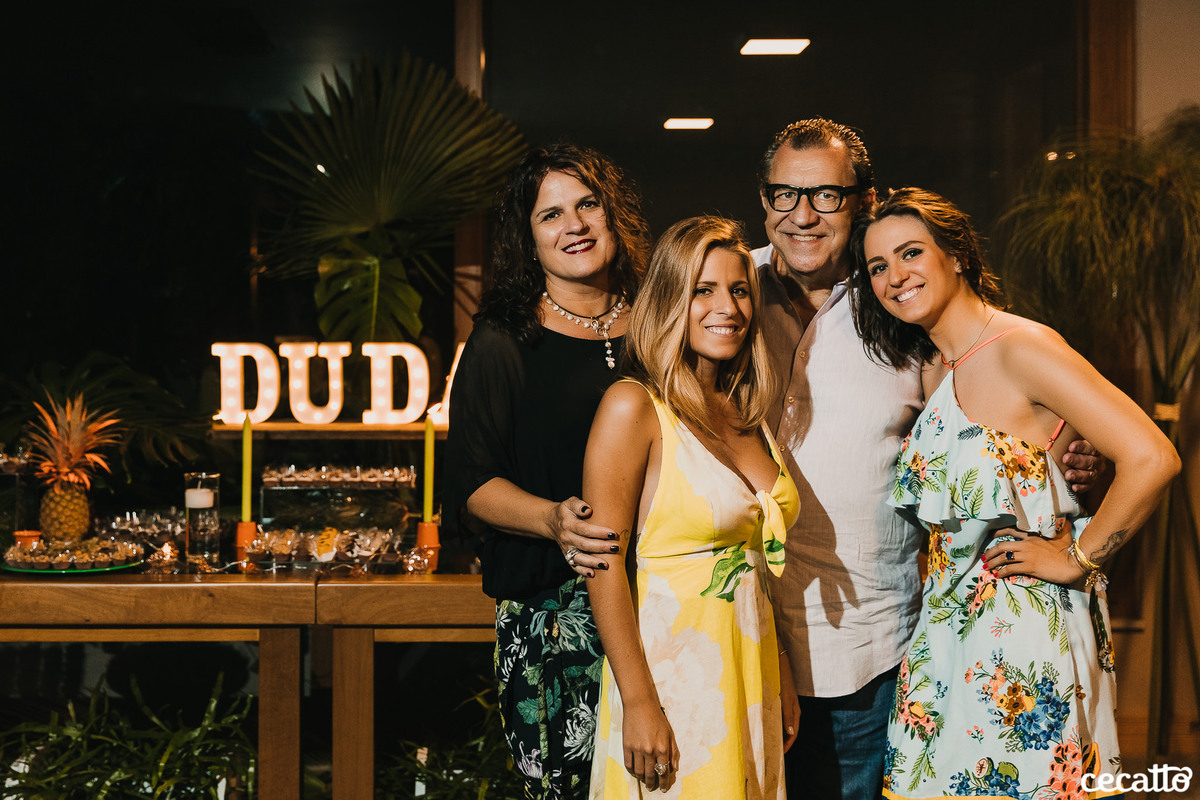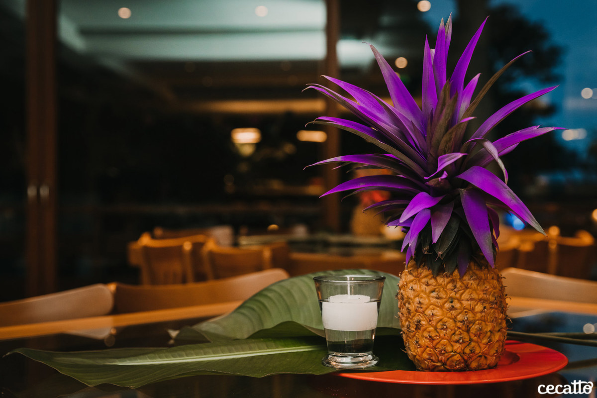 Através dos detalhes da decoração, ficou visível o quanto a mãe e a irmã colocaram amor e se dedicaram para deixar tudo do jeitinho dela. O salão estava moderno e estiloso, com direito a lindos abacaxis coloridos, e de surpresa, ainda teve um show da Banda Samba e Amor!